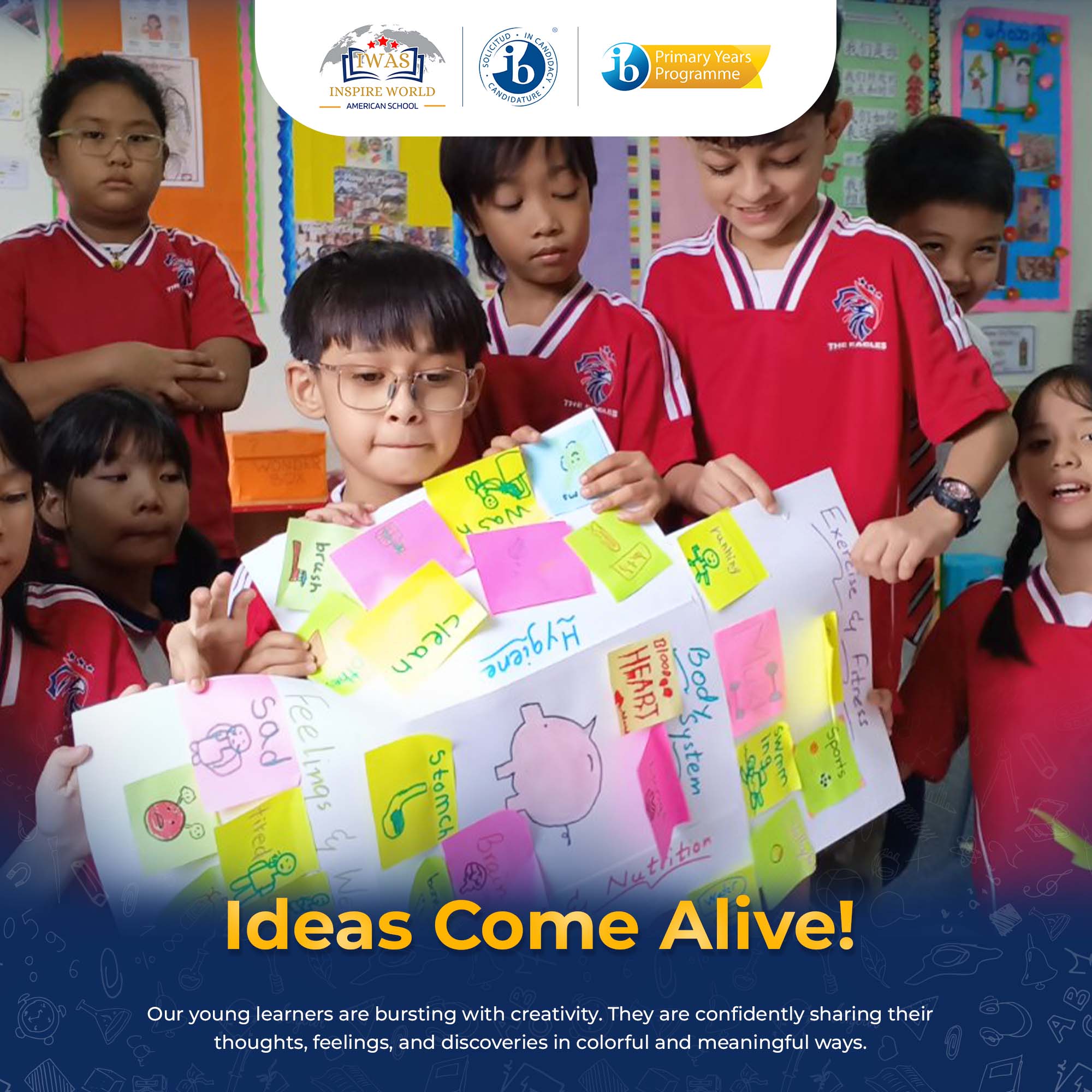 Our young learners are bursting with creativity. They are confidently sharing their thoughts, feelings, and discoveries in colorful and meaningful ways. At IWAS, every childโs imagination has a place to shine.